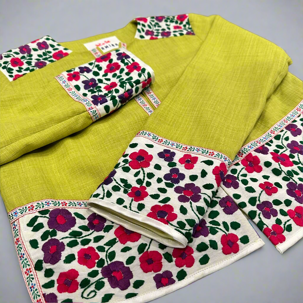 - Rich Green Base: A sophisticated and versatile shade that enhances the vibrant floral embroidery.