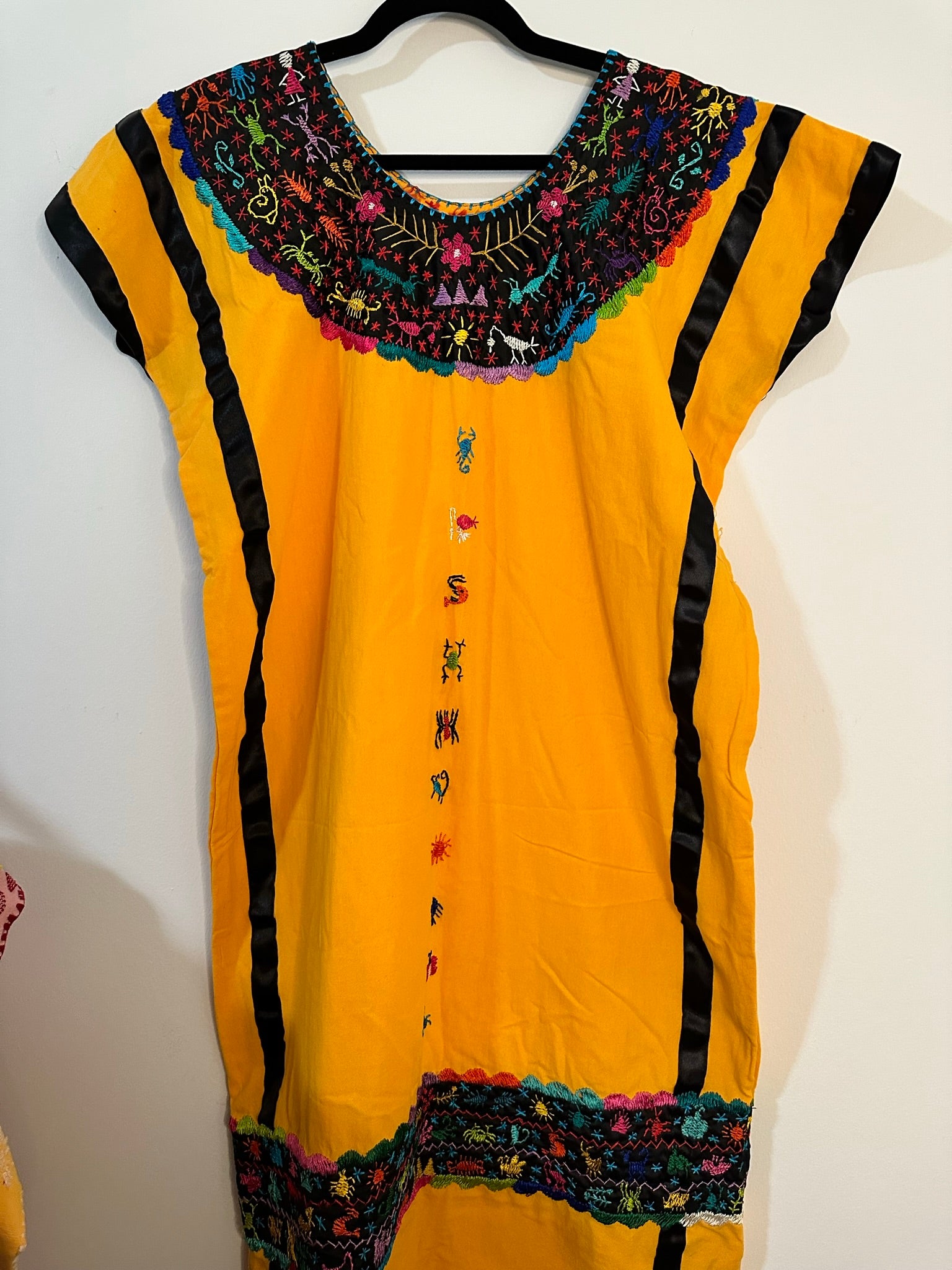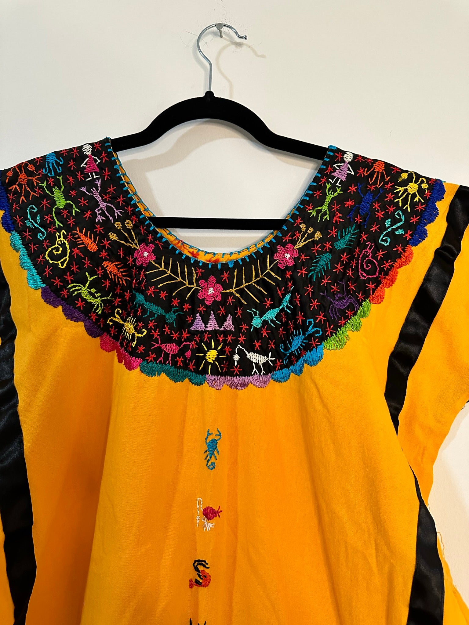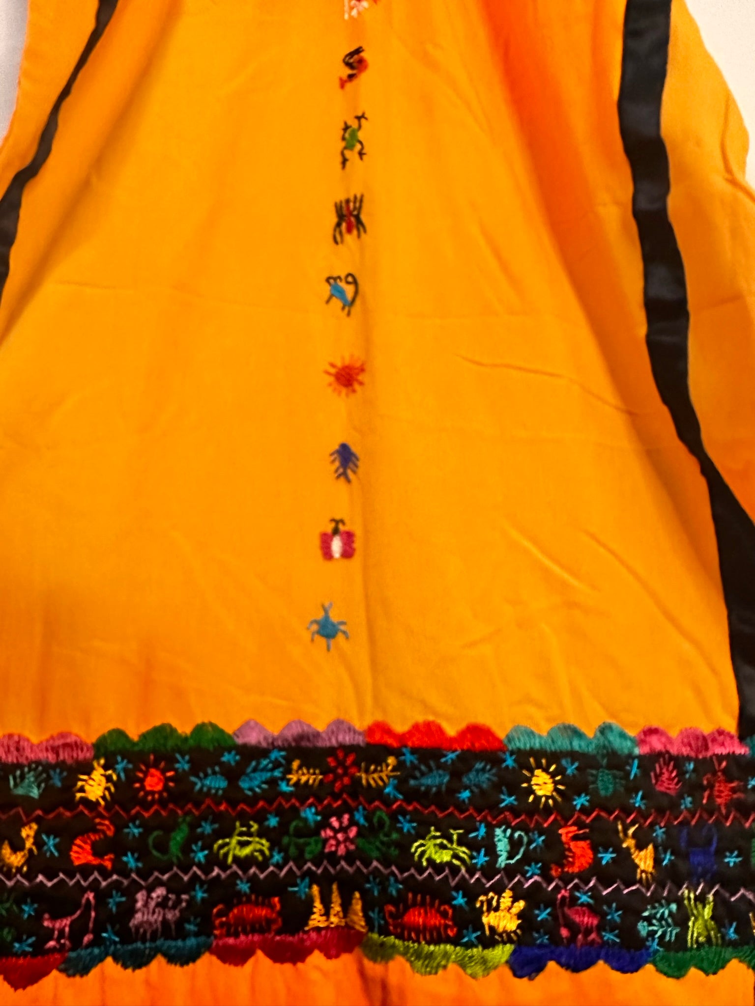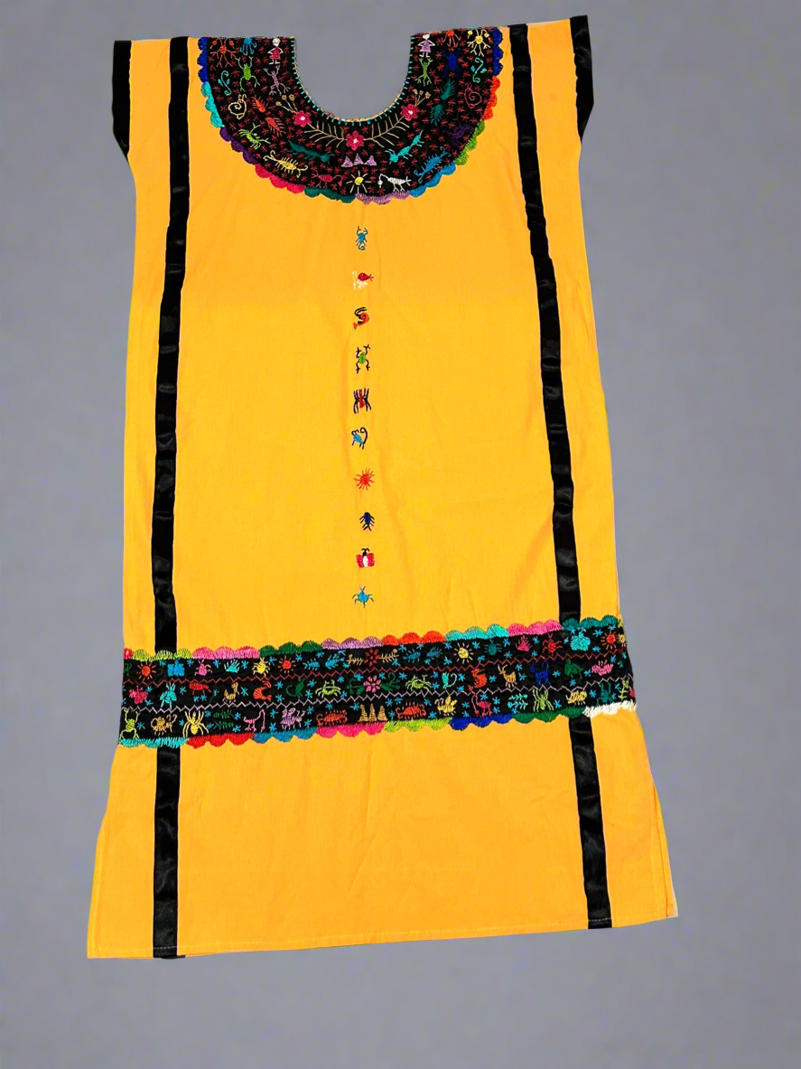 The Huipil Adriana is a radiant display of artistry and tradition, meticulously handcrafted in Don Luis, Oaxaca. Featuring vibrant multicolor animal embroidery on a striking yellow rayon fabric, this huipil is a lively tribute to the region’s natural beauty and cultural heritage, created by master artisan Royer.