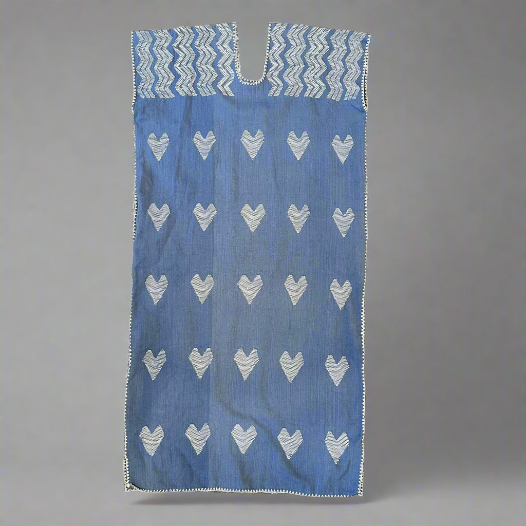 The Huipil Edith is a stunning expression of Oaxacan artistry, meticulously crafted by master artisan Edith Alavez and the talented Xiku Nuu Yo’o Kua’a collective. Its soft blue tones, adorned with delicate white heart embroidery, reflect a timeless blend of culture, sustainability, and elegance.